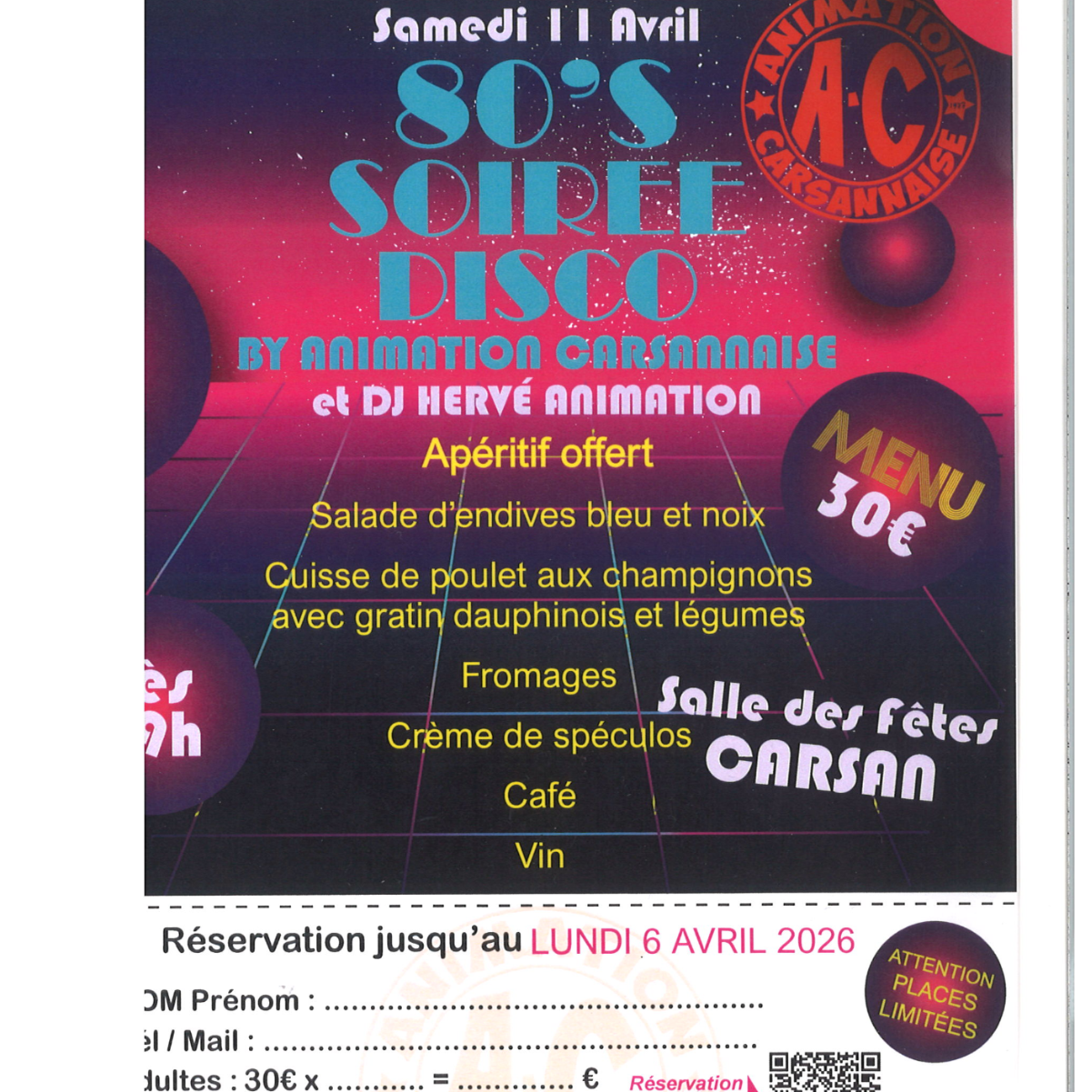 L'animation carsanaise organise une soirée disco le samedi 11 avril 2026 à partir de 19H à la salle polyvalente de Carsan